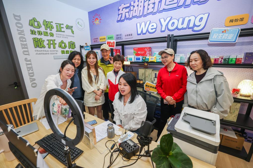 4月20日,在杭州市临平区东湖街道老年学校直播间,社区老年人在视频直播课程。