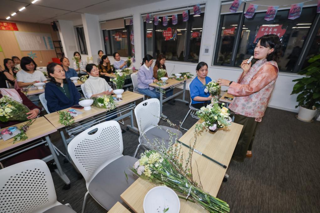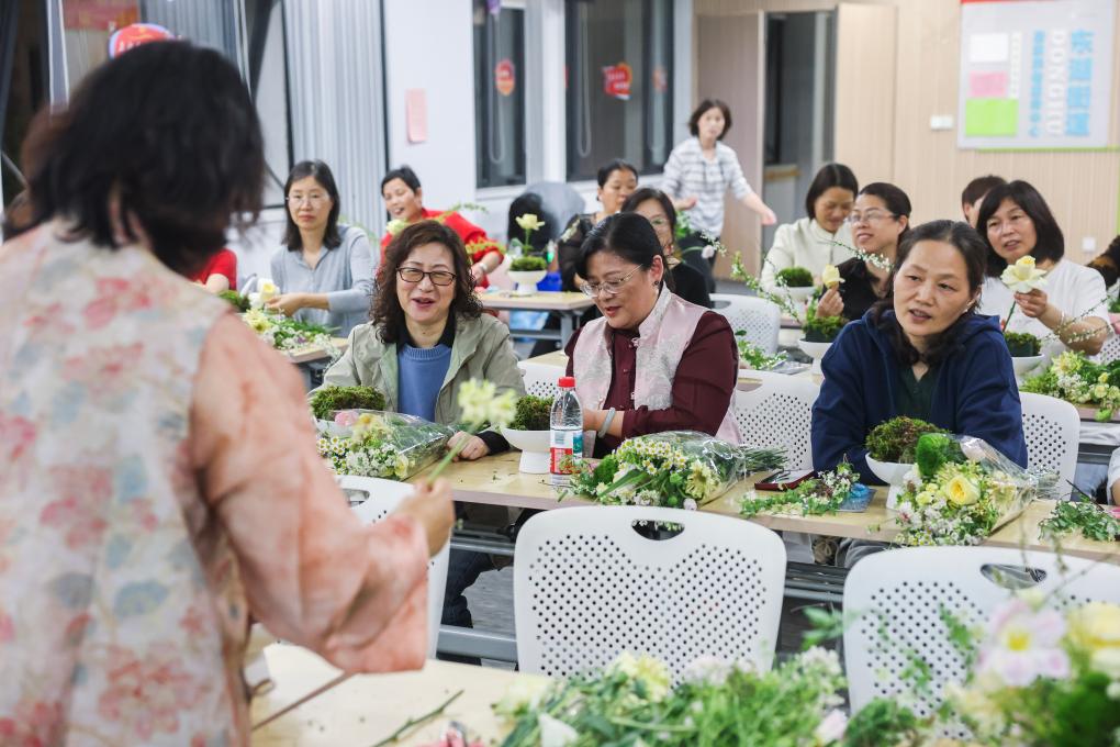 4月20日,在杭州市临平区东湖街道老年学校教室里,社区老年人在上花艺课程。
