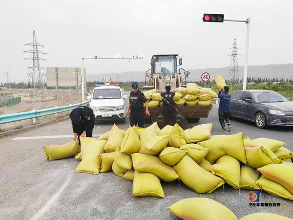在紧急情况下,阿图什市公安局工业园区派出所迅速行动,第一时间组织警力疏导交通并协助货主将散落在道路中央的货物转移至安全区域。同时,协调辖区铲车司机,对货物进行快速清理和重新装载,经过一个半小时的努力,散落在路面上的近5吨货物被清理完毕,及时消除道路安全隐患,恢复正常交通秩序。(新疆克州阿图什市公安局供稿)
