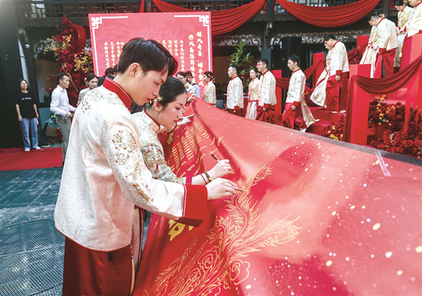 风成于上、俗化于下。近年来,越来越多新人选择集体婚礼,倡导文明简约的婚嫁理念,通过精心设计的集体婚礼仪式,打造既庄重又温馨的婚礼体验,既减轻经济负担、又传承美好家风,倡导婚俗改革文明新风尚。图为在浙江省诸暨市西施故里景区内,参加集体婚礼仪式的新人们签订移风易俗简婚承诺。新华社记者
