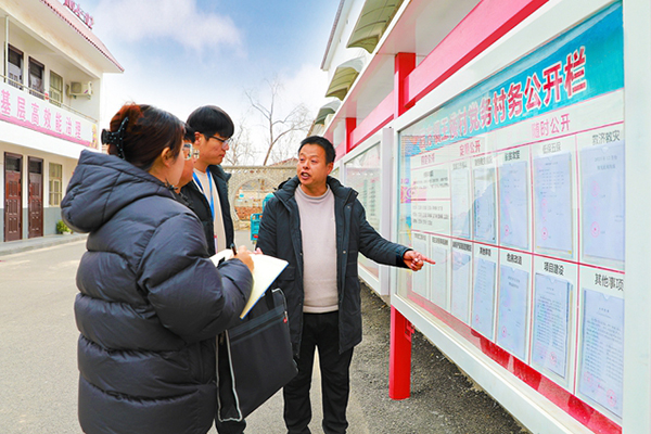 河南省濮阳市纪委监委推动加大农村集体“三资”公示公开力度,督促各村(社区)综合运用管理平台、村务公开栏等,及时公开“三资”管理使用情况。图为近日,该市台前县纪检监察干部在后方镇王楼村查看公开公示情况。张乐斌
