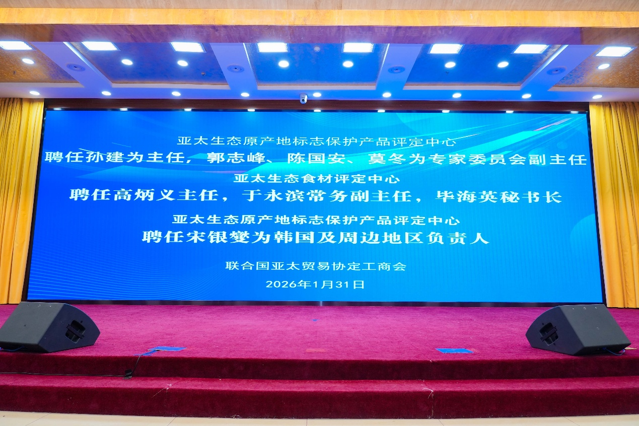 孙建被聘为亚太生态原产地评定中心主任,郭志峰、陈国安、莫冬被聘为专家委员会副主任。高炳义被聘为亚太生态食材评定中心主任,于永滨为常务副主任,毕海英为秘书长。韩国文化创意技术会社首席代表宋银燮被聘为亚太生态原产地标志保护产品评定中心韩国及周边地区负责人。
