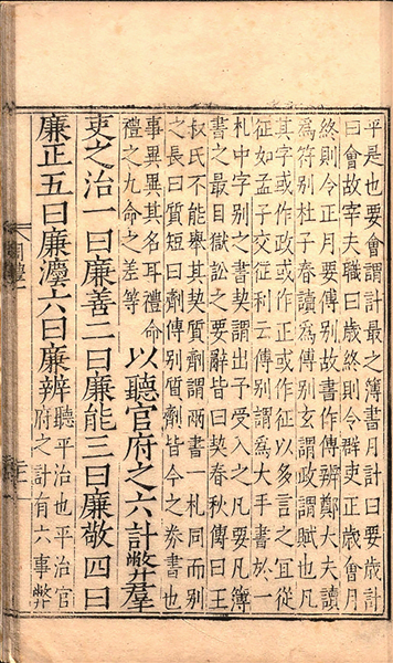 《周礼·天官冢宰》载:“以听官府之六计,弊群吏之治。一曰廉善,二曰廉能,三曰廉敬,四曰廉正,五曰廉法,六曰廉辨。”“六事”前面均加上了一个“廉”字,既以“六事”评断官吏,同时又“以廉为本”。图为《周礼》明刻本。