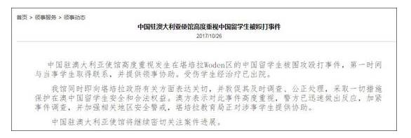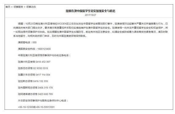 27日,驻澳使馆指出,对23日发生的中国留学生被围攻殴打事件严重关切并谴责暴力行为,已向澳政府有关部门提出交涉,要求澳方高度重视并采取切实措施维护在澳中国留学生的安全。驻澳使馆一向关注并重视留学生安全和权益保护,将一如既往提供领事保护与协助。在此提醒在澳中国留学生加强防范,前往有关地区注意安全,如遇安全威胁或暴力袭击等突发紧急情况,请及时联系当地警方,向相关政府部门申诉,及时与中国驻澳使领馆保持联系。