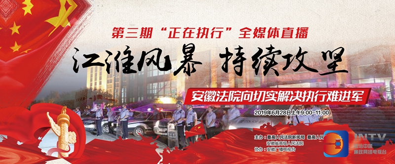 2019年6月28日(星期五)上午9:00~11:00。最高人民法院新闻局、最高人民法院执行局、安徽省高级人民法院将联合举办“‘江淮风暴’持续攻坚——第三期‘正在执行’全媒体直播”活动。聚焦科教之城合肥,连线皖南皖北,对安徽法院向切实解决执行难进军的一批执行案件进行全程直播。